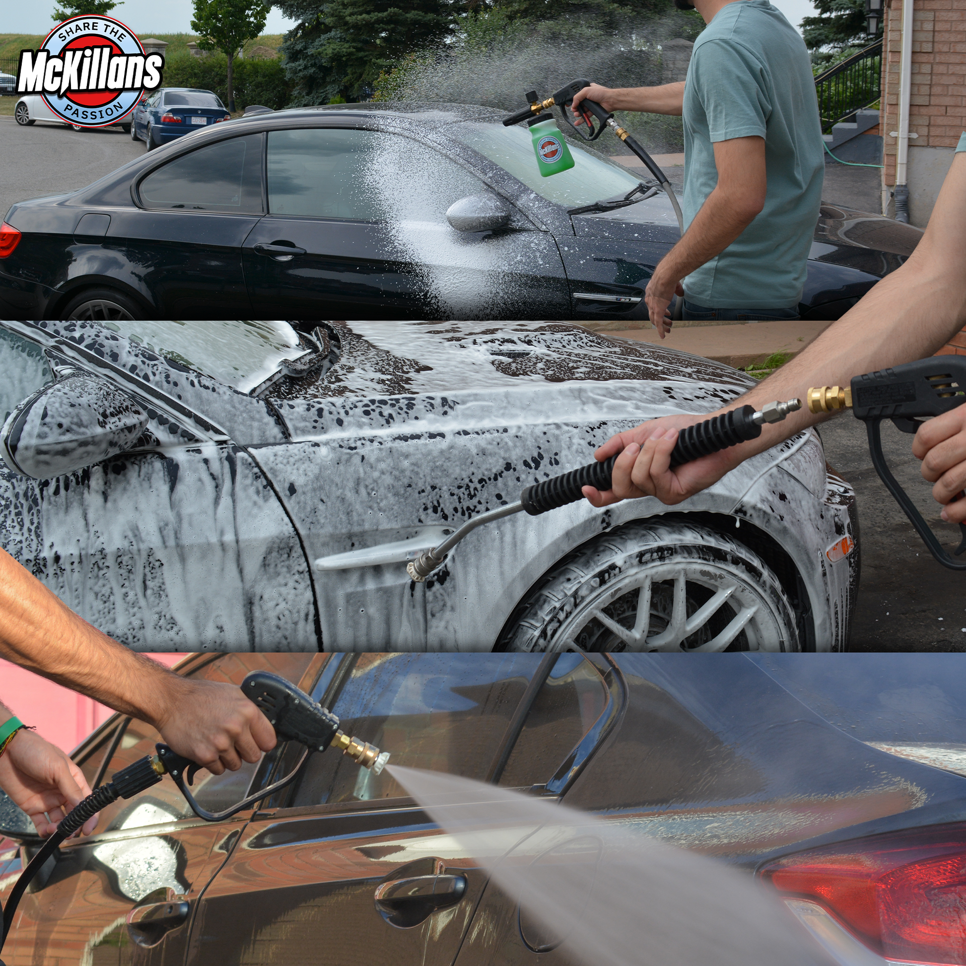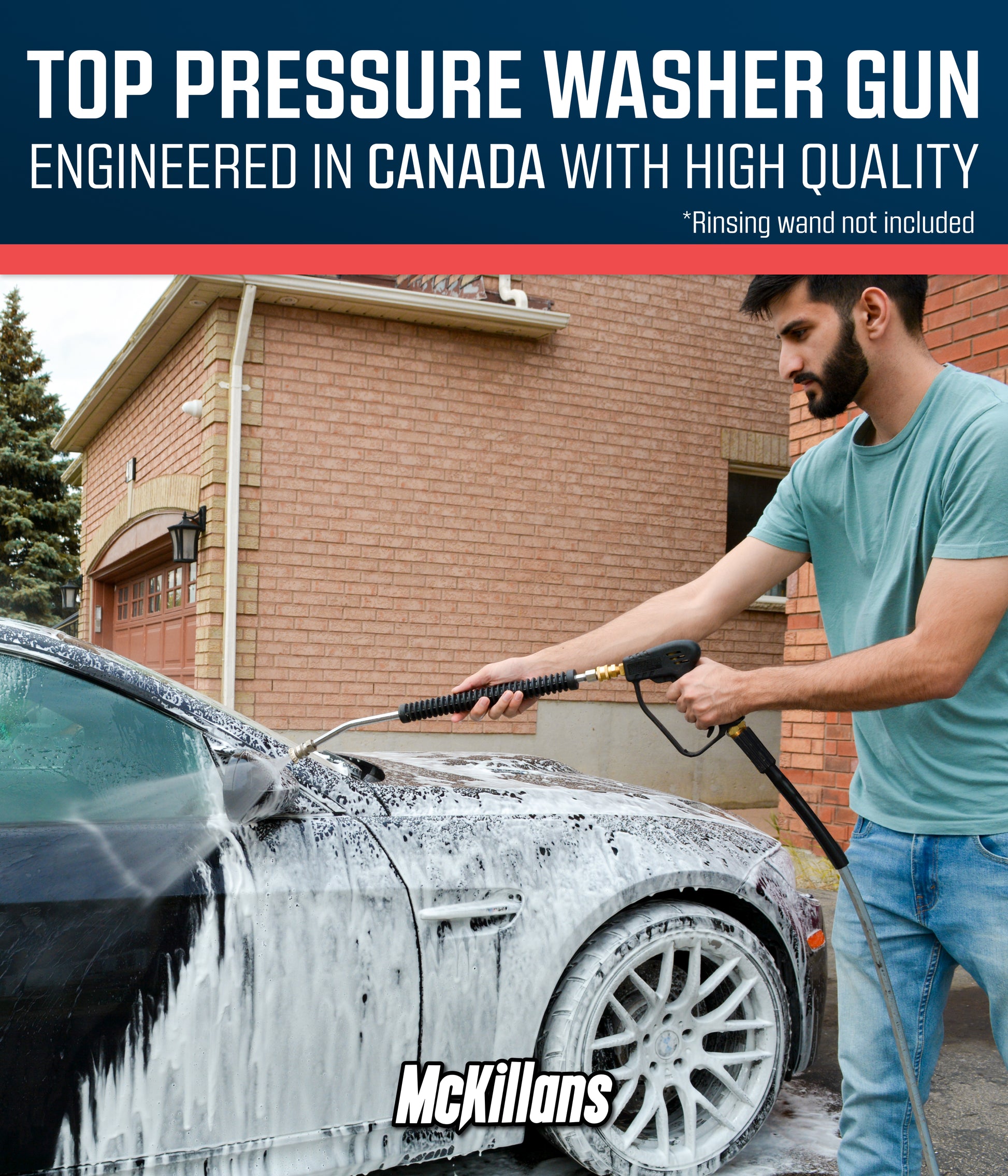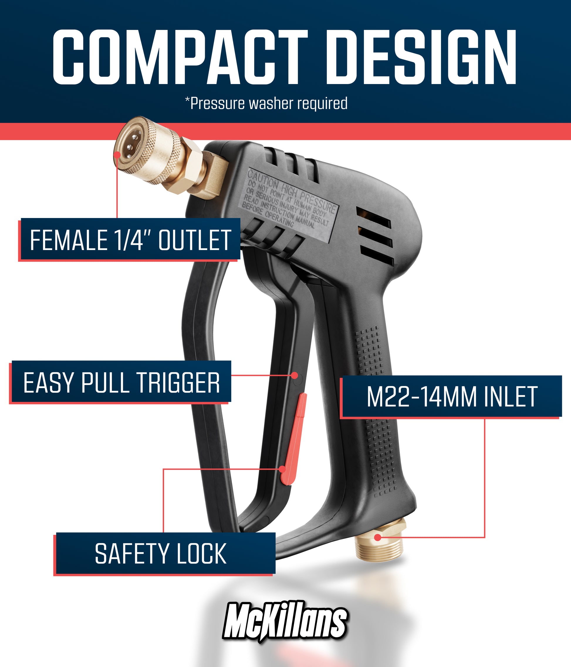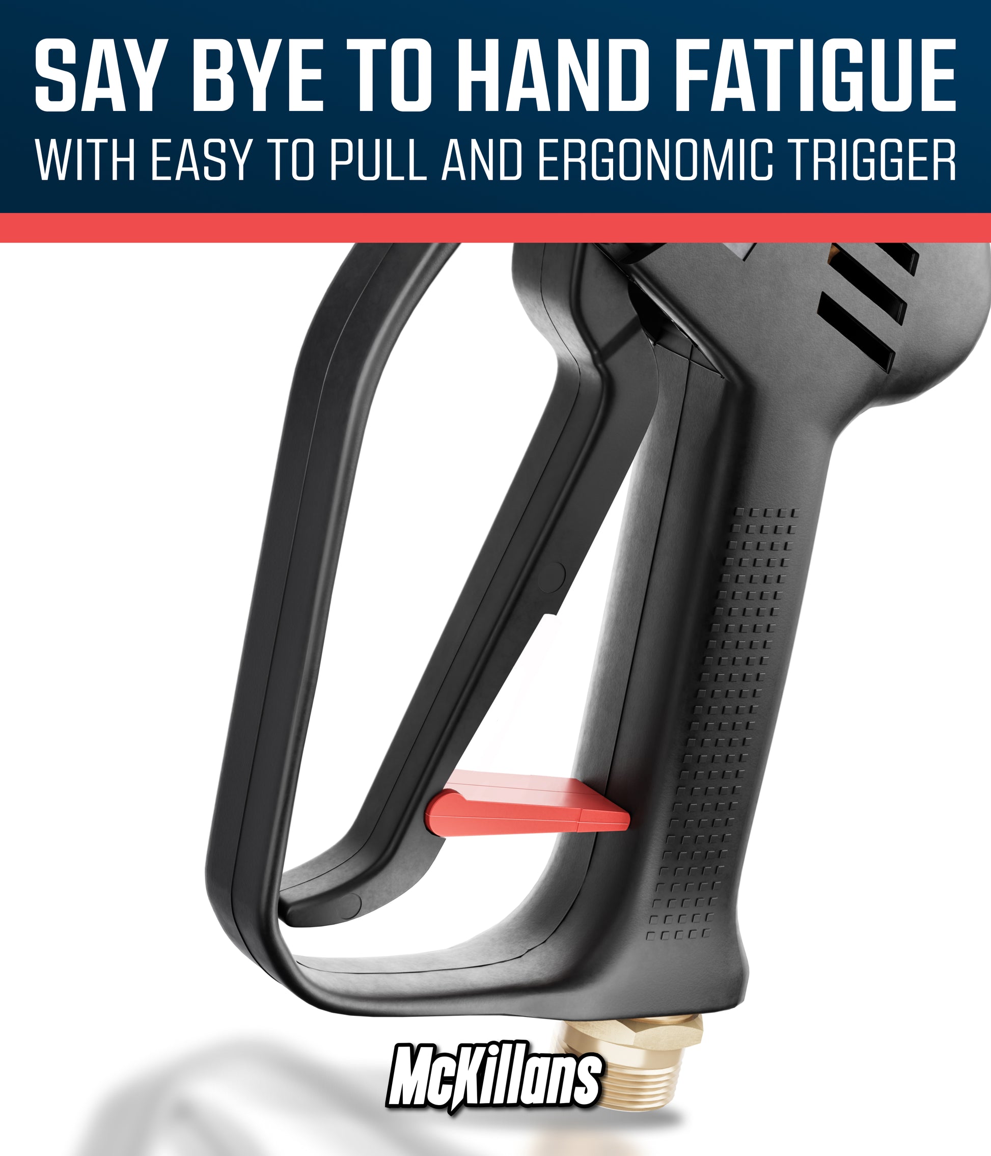 The McKillans Pressure Washer Gun is the perfect upgrade for your power washer. The small body design makes the gun easy to handle and maneuver. Stop using the long, leaky, and cheap stock gun that comes with your pressure washer, and upgrade to a quality gun. The small design makes it perfect to use with the foam cannon!